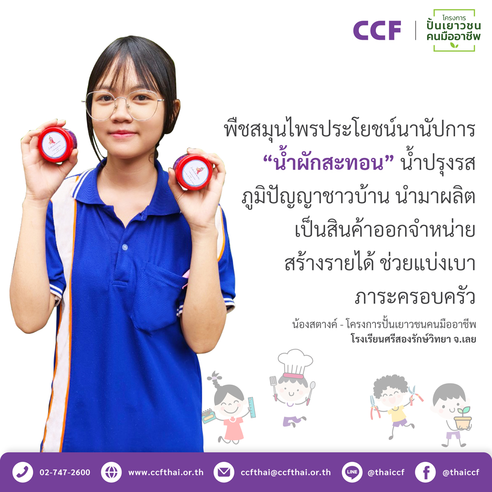 “หนูจำได้ว่าตนเองได้เข้ามาเป็นเด็กในความดูแลของมูลนิธิ ซี.ซี.เอฟ.ฯ ตั้งแต่เรียนชั้นประถมศึกษาปีที่ 3 จากนั้นมาหนูได้เข้าร่วมทำกิจกรรมต่าง ๆ และได้เข้าร่วมการอบรมเกี่ยวกับความรู้เรื่องสุขภาพ สุขอนามัย สิทธิเด็กและเยาวชน ฯลฯ ในแต่ละค่ายก็จะมีพี่ ๆ และวิทยากรที่มามอบความรู้และความสนุกสนานอย่างเป็นกันเอง ซึ่งความรู้ที่หนูได้รับในแต่ละค่ายได้ก็สามารถนำมาประยุกต์ใช้ในชีวิตประจำวันได้จริง โครงการปั้นเยาวชนคนมืออาชีพเป็นอีกโครงการหนึ่งที่หนูมีโอกาสเข้าร่วมทำกิจกรรมที่โรงเรียน ทำให้หนูกับเพื่อน ๆ มีประสบการณ์ด้านการขนมขายเป็นอาชีพที่สามารถนำไปสร้างรายได้ ทั้งในระหว่างเรียนหรือในช่วงปิดเทอม