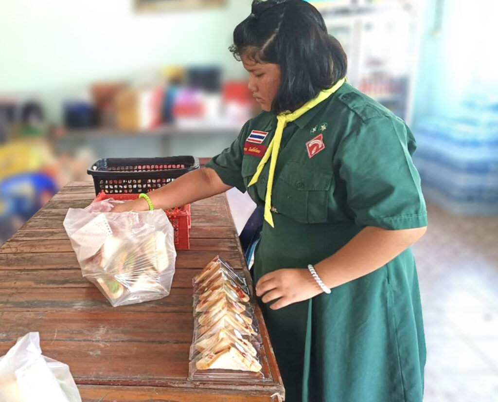 “น้องไข่หวาน” นักเรียนชั้น ป.6 โรงเรียนวัดโกรกแก้ววงพระจันทร์ ผู้ไม่เคยยอมแพ้กับข้อจำกัดของชีวิต ทุก ๆ วัน หลังจากอาบน้ำเสร็จเรียบร้อย เธอก็จะเริ่มลงมือทำ “แซนวิชด์ห่มผ้า” จำนวนวันละ 50 ชิ้น เพื่อส่งขายที่สหกรณ์โรงเรียน ซึ่งเธอเป็นคนลงมือทำเองทั้งหมดทุกขั้นตอน ตั้งแต่ขั้นตอนการเตรียมวัตถุดิบ การห่อขนมปังด้วยไส้ต่าง ๆ อย่างพิถีพิถัน ไปจนถึงจัดเรียงใส่กล่องอย่างประณีต