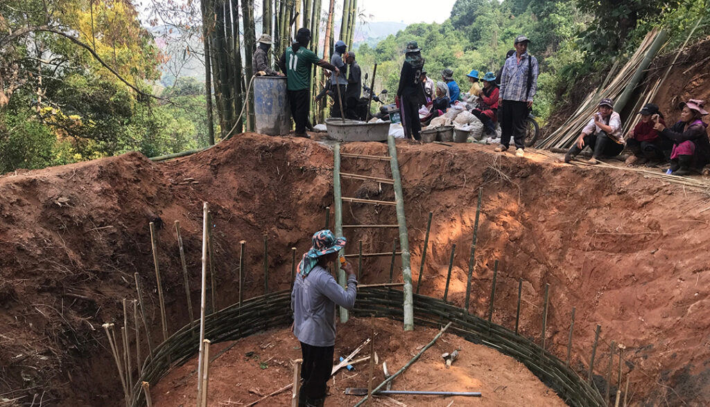 โดยก่อนลงมือทำผู้นำและแกนนำชุมชนได้ปรึกษาหารือร่วมกันกับเจ้าหน้าที่โครงการให้เด็กและผู้ปกครองมาช่วยกันตามกำลังพร้อมแบ่งหน้าที่ บ้างช่วยกันปรับเตรียมพื้นที่ บ้างก็ลงแรงช่วยกันผ่าซีกไม้ไผ่เป็นชิ้น สำหรับบริเวณไหนที่เข้าออกลำบากรถยนต์ไม่สามารถขึ้นมาก็จำเป็นต้องใช้แรงคน ช่วยกันคนละไม้ละมือเป้าหมายของทุกคน คือ เพื่อชุมชนของเรา” และคาดว่าอีกไม่นานแท็งก์น้ำจะพร้อมทันใช้งานก่อนเข้าฤดูฝนนี้